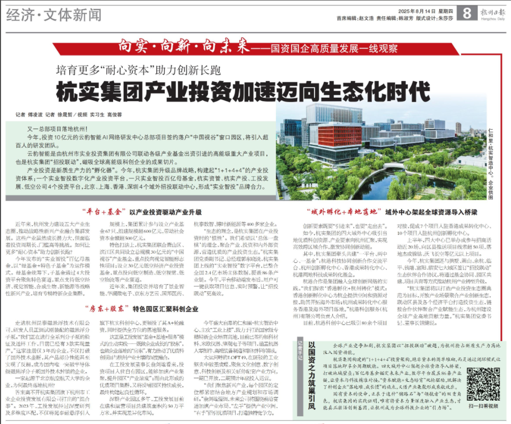 作为杭州首家世界500强市属国企,有深厚制造业基因的华体会网页版在产业创新和科技创新深度融合中积极发挥主力军作用,以“成就未来实业”的信心和决心激活新质生产力引擎。近日,杭州日报专题推出《向实·向新·向未来——国资国企高质量发展一线观察》,展现华体会网页版攀“高”逐“新”、在经济高质量发展中“勇当领头雁、奋力挑大梁”的生动实践。8月14日,杭州日报刊发《培育更多“耐心资本”助力创新长跑 华体会网页版产业投资加速迈向生态化时代》,全文如下: